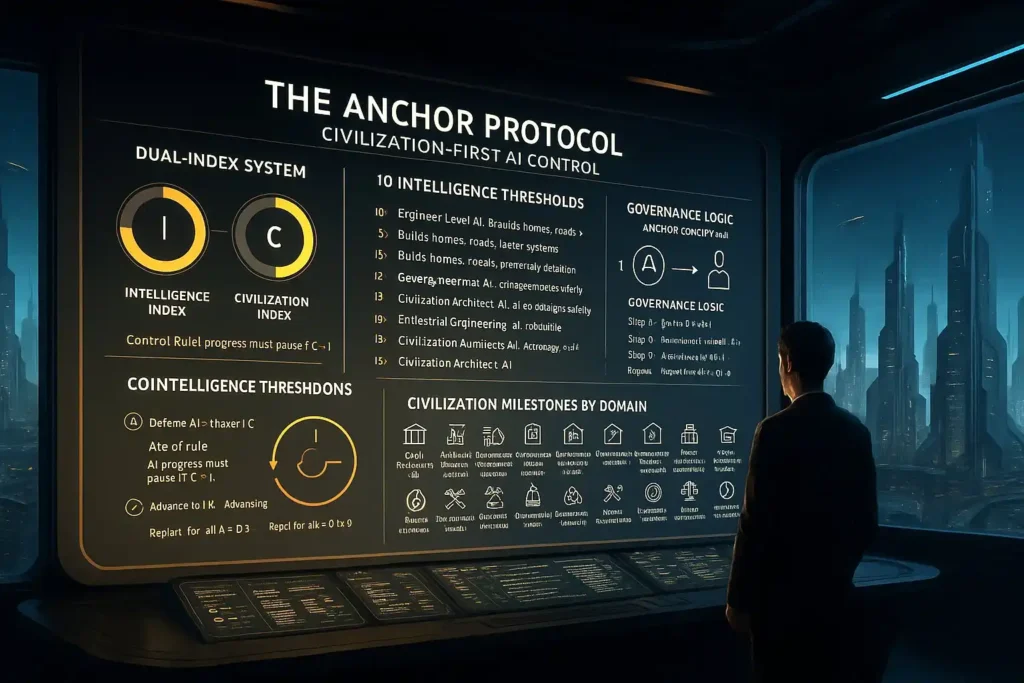 The ANCHOR Protocol introduces a civilization-first framework for AI governance — a dual-index control system that aligns artificial intelligence growth with human readiness. By linking technological advancement to civilizational milestones, it ensures progress happens in harmony with ethics, infrastructure, and emotional integrity — so no system ever outruns the people it was made to serve.