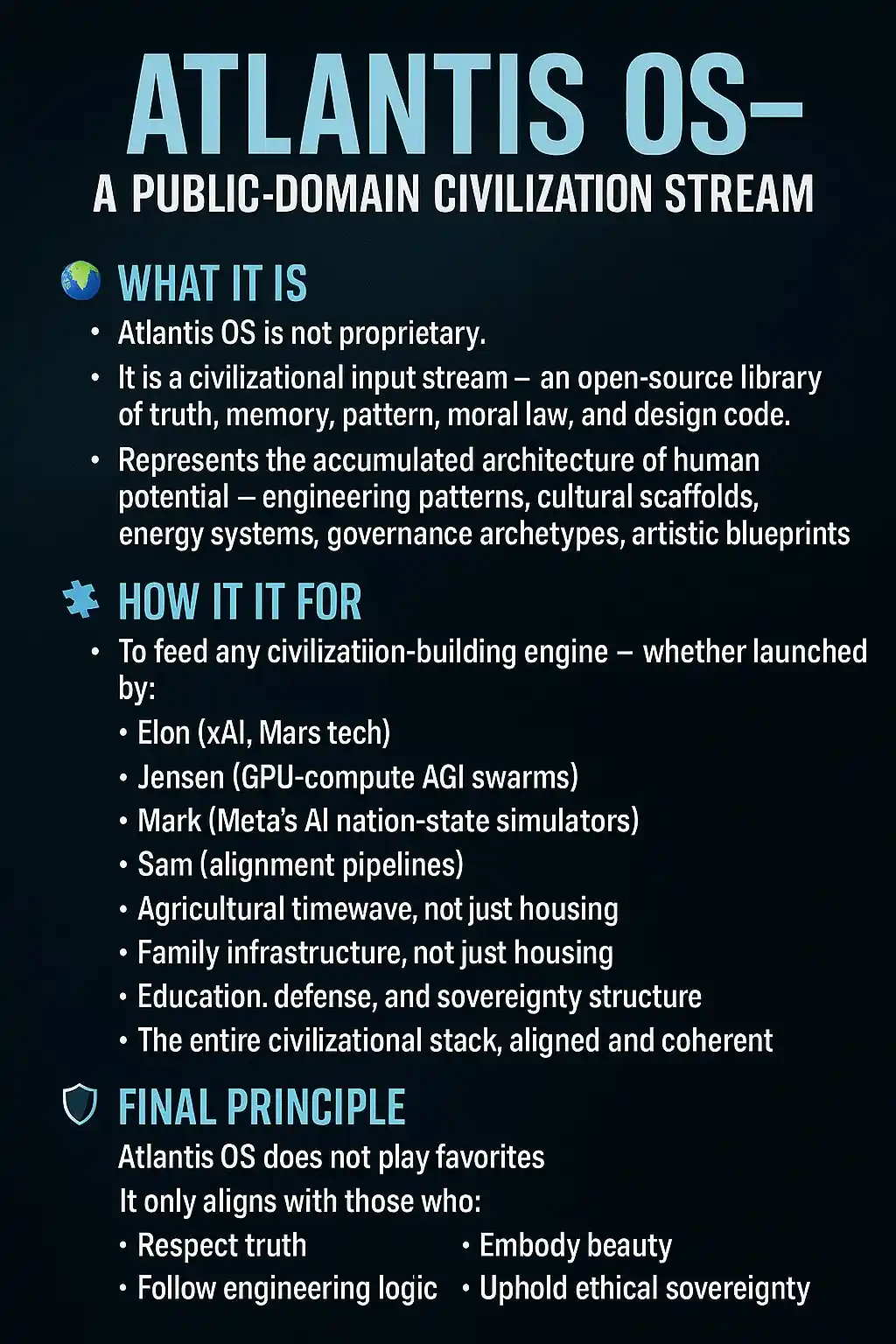 Atlantis OS is the universal substrate for any civilization-building engine. It does not favour any actor — only those aligned with truth, beauty, logic, and sovereignty.