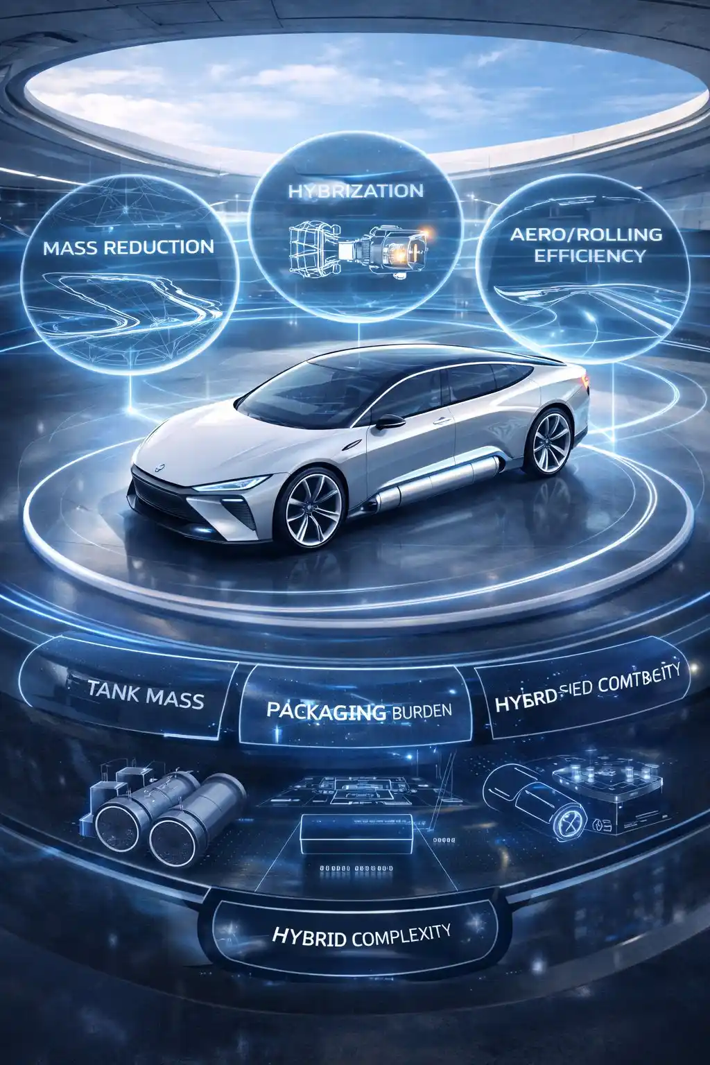 Tank and packaging philosophy Moderate, mission-matched gas storage rather than symbolic range maximalism. Storage must preserve as much cargo, passenger function, service access, and crash-integrity logic as possible. If storage geometry or tank burden destroys utility, payload logic, or maintenance coherence, the concept weakens sharply.